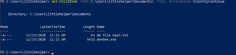 Get-ChildItem -Path C:\Users\littlehelper\Documents\ -File -ErrorAction SilentlyContinue実行結果は以下のとおりです。「db file hash.txt」がそのファイルに当たりそうですね。