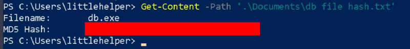 Get-Content -Path '.\Documents\db file hash.txt'テキストの中身は、ファイル名とMD5のハッシュ値が保存されているようです。