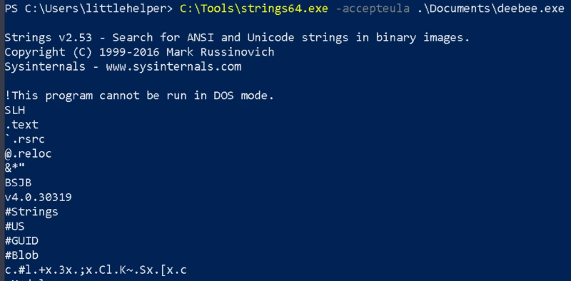 C:\Tools\Strings64.ext -accepteula .\Documents\deebee.exe実行すると、実行ファイル内の文字列が表示されています。