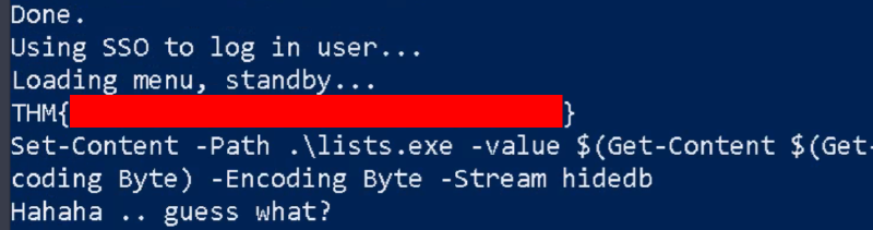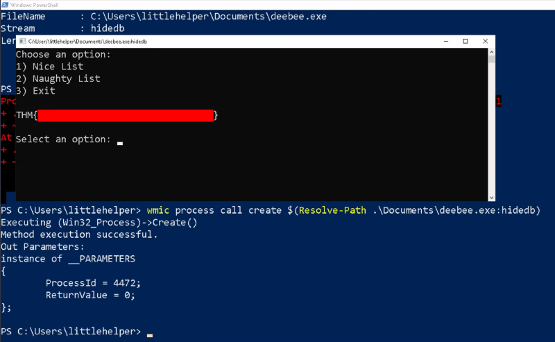 wmic process call create $(Resolve-Path .\Documents\deebee.exe:hidedb)実行すると、flagを取得できます。